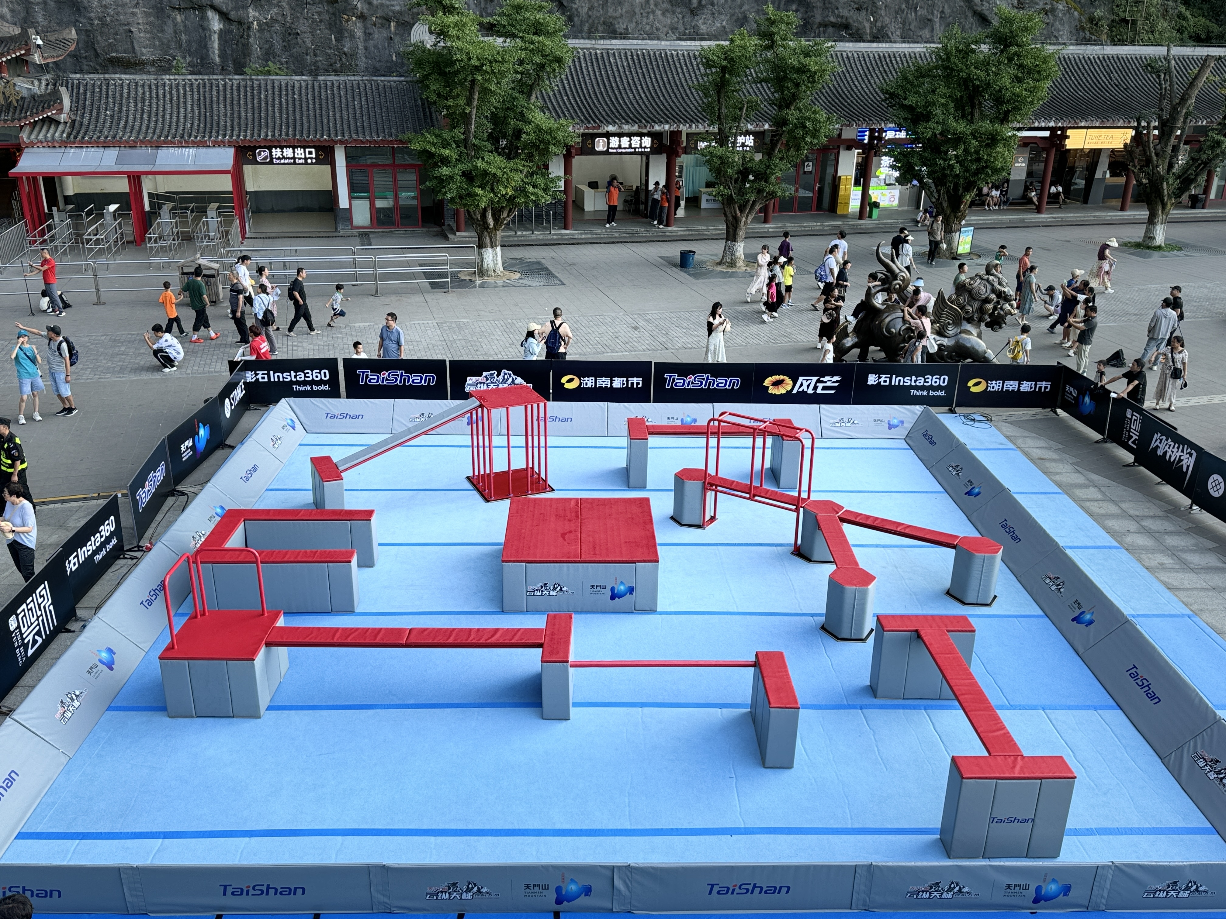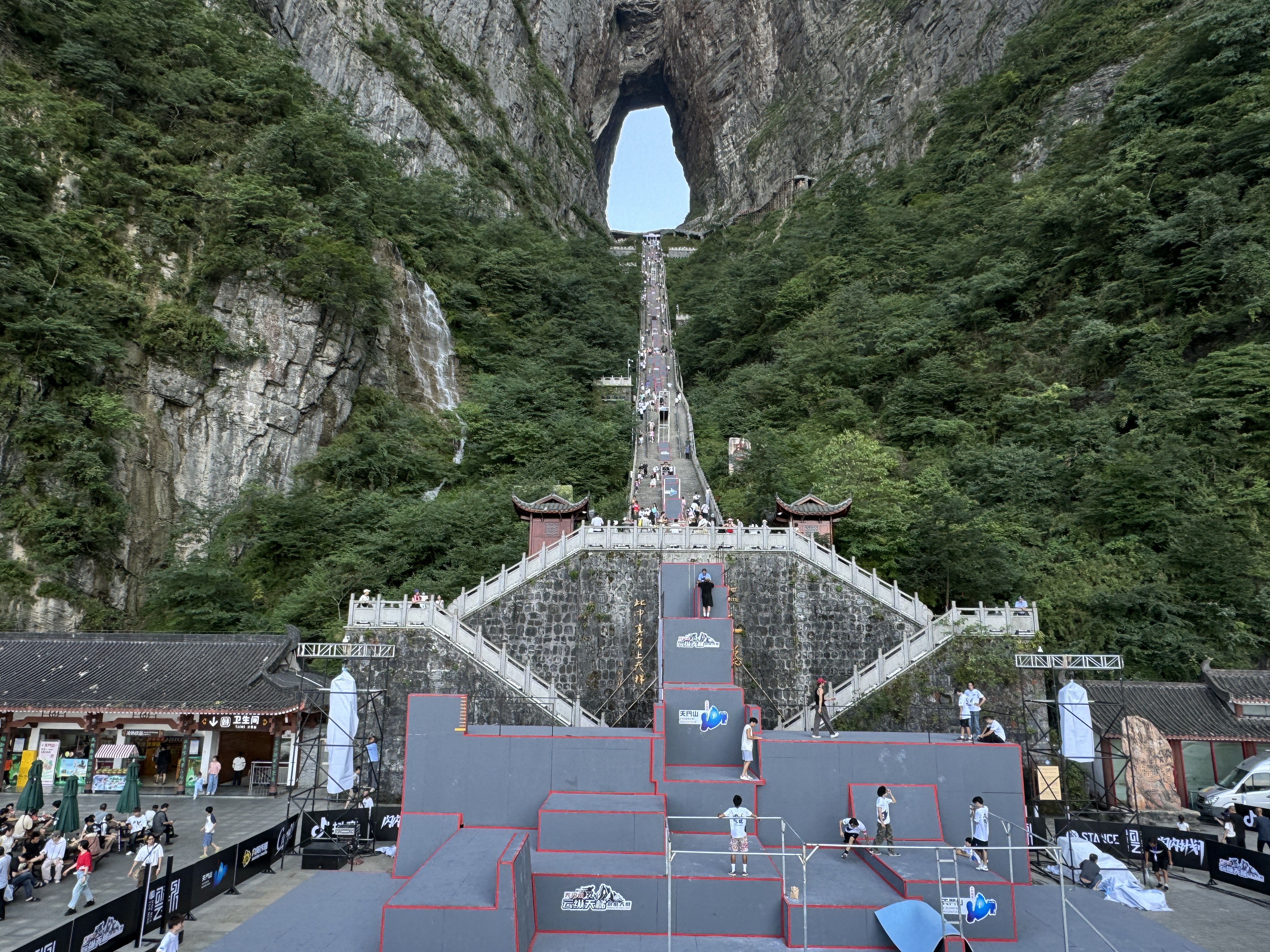 本场赛事的赛道依附于天门洞999级天梯搭建,赛道起点设在世界海拔最高天然穿山溶洞“天门洞”洞口,沿着狭窄陡峭、共有999级台阶的登山步道“天梯”向下一直延伸至游客广场,全长近300米,垂直落差达150米,分五缓四陡,平均斜度45度,共设置108组障碍道具。有了JN江南体育跑酷器材的加持,赛事将更加精彩刺激。