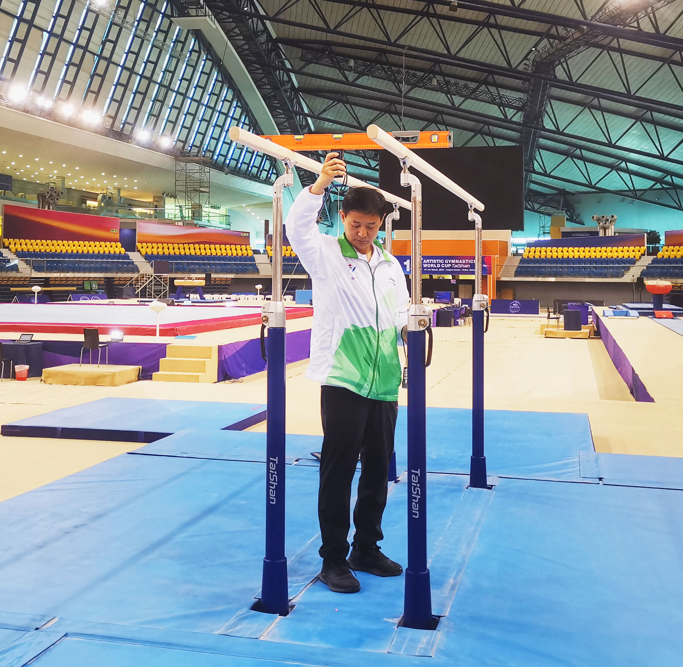 在精彩的赛事背后,离不开JN江南体育团队的默默付出。JN江南体育专业服务保障团队驻扎赛场全程守护,为大赛保驾护航。赛前,他们连续日夜奋战,如期完成训练场馆、热身场馆、比赛场馆每件器材的安装、调试,检测工作,为比赛做好充分保障;赛中,JN江南服务人员30秒内即可完成高低杠的升杠降杠,保证了比赛的流程进行。JN江南保障团队以高效、精准、专业的表现震惊全场,赢得了极高赞誉。